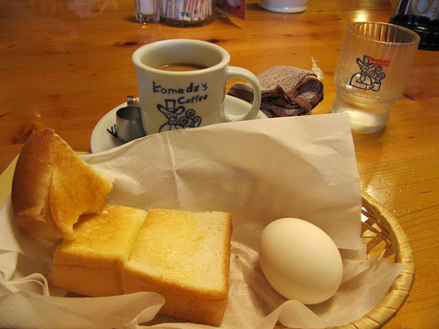 In the Morning (well around 10:30am) I decided to go for coffee. I heard that one of the specialties in Nagoya are coffee shops that serve free food in the morning with your coffee. So I went to this place near me called Komeda's Coffee. I got seated at a communal like table (the place was full) and ordered a hot coffee. The waitress asked me if I wanted a morning bread (I actually understood that since morning was basically in Japanized english (モーニング-mooningu) and I know the word for bread is pan). Then I guess she asked me if I wanted butter or jam which I didn't quite understand but butter it was. So basically, untill 11am, if you order a drink such as coffee, you get a toast with butter or jam and a boiled egg for free! They have an ad for this on their website (for morning service i.e. "mooningu saabisu" - モーニングサービス) that looks hilariously similar to my picture (minus the little bite i took before realizing I should take a picture)! Cost of coffee - 380yen so around $4.70.